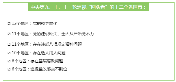 从第九轮开始,中央巡视每轮都安排对四个省区市开展“回头看”。截至目前的第十二轮巡视,已经对辽宁、安徽、山东、湖南、天津、江西、河南、湖北、北京、重庆、广西、甘肃、内蒙古、吉林、云南、陕西等十六个省区市进行了“回头看”。