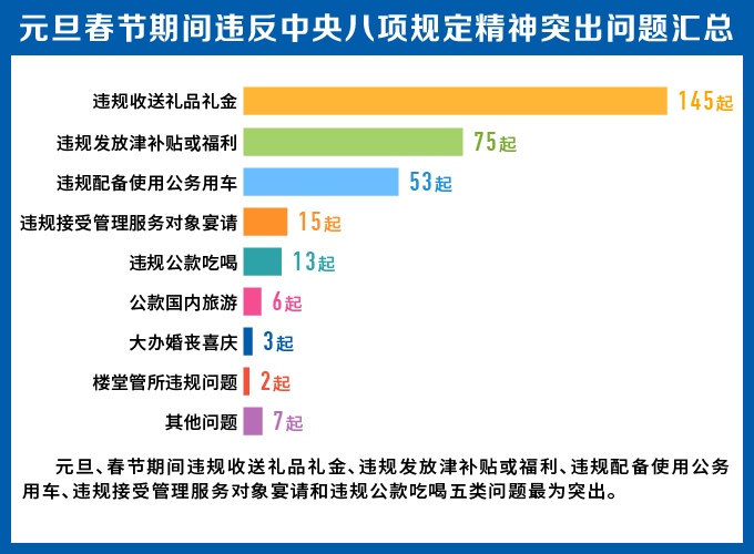 其中,节日期间收礼送礼问题最为突出,占全部问题比重超过1/3,主要表现为收送购物卡、充值卡等。例如,天津市静海区环保局高级工程师信连奎在2015年春节至2018年春节期间,多次收受辖区内企业赠送的礼金,合计9.3万余元。