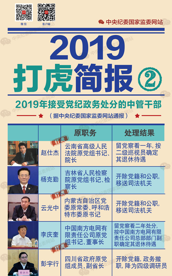 2019年全年,中央纪委国家监委网站公布了秦光荣、李谦、彭宇行等20名中管干部接受中央纪委国家监委审查调查消息,以及缪瑞林、孟宏伟、努尔·白克力等23人的党纪政务处分结果。