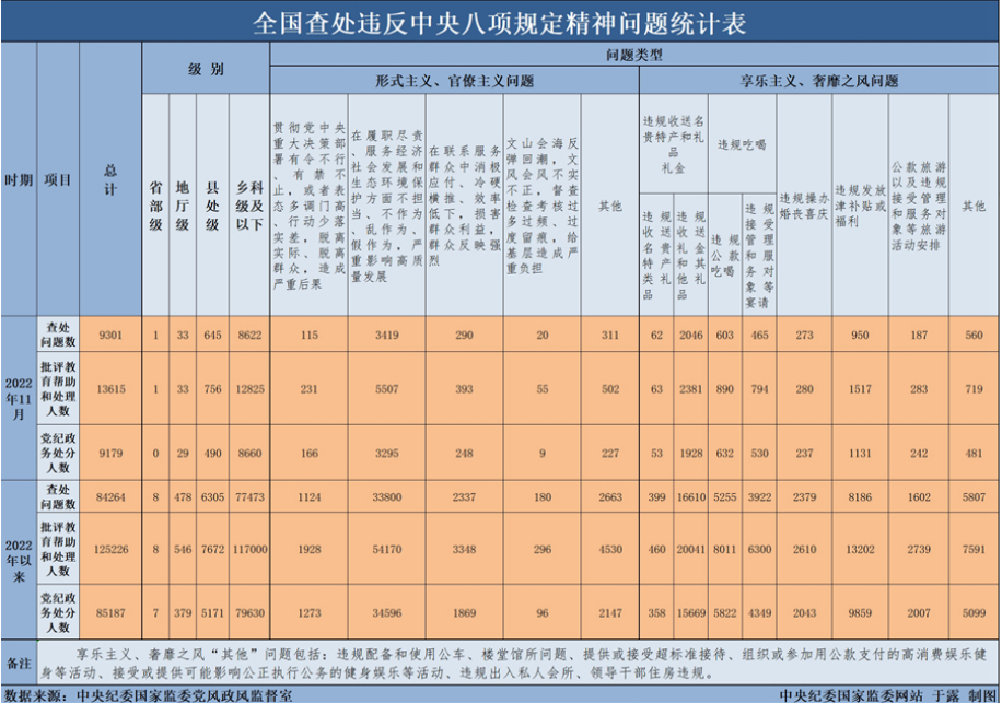 12月27日,中央纪委国家监委公布了2022年11月全国查处违反中央八项规定精神问题汇总情况。今年11月,全国共查处违反中央八项规定精神问题9301起,批评教育帮助和处理13615人,其中,党纪政务处分9179人,这是连续第111个月公布月报数据。