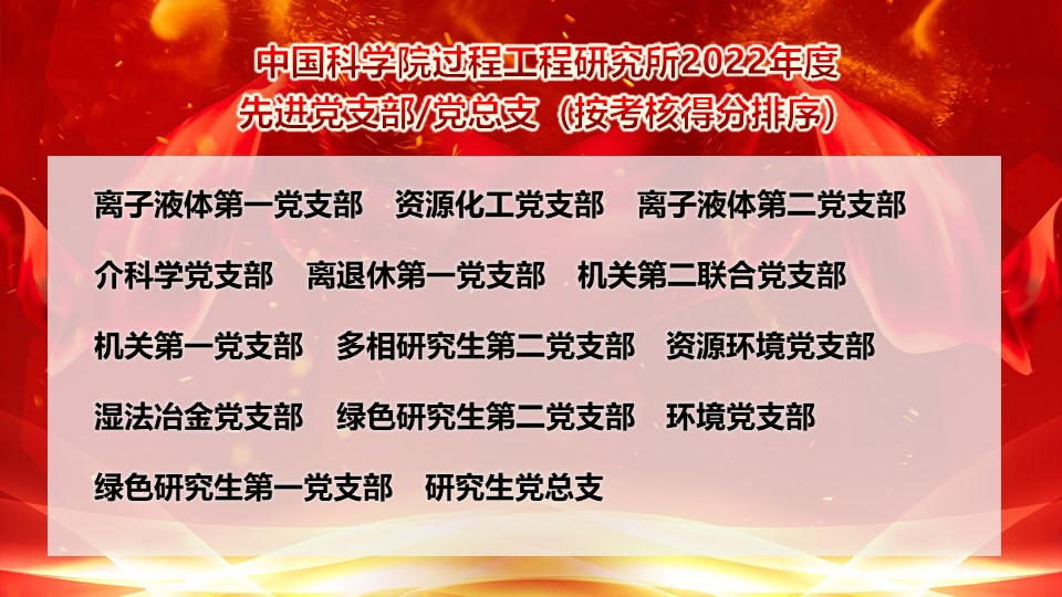 经由所党委委员、各党支部/总支书记组成的评审团打分,被评为“先进”的党支部为(按得分高低排序):离子液体第一党支部、资源化工党支部、离子液体第二党支部、介科学党支部、离退休第一党支部、机关第二联合党支部、机关第一党支部、多相研究生第二党支部、资源环境党支部、湿法冶金党支部、绿色研究生第二党支部、环境党支部、绿色研究生第一党支部。评为“先进”的党总支为研究生党总支。