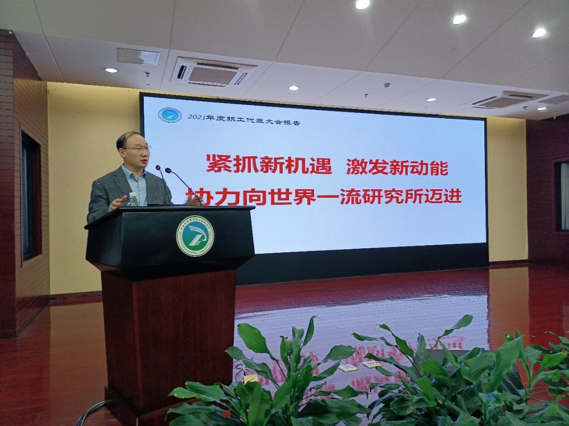 随后,党委书记、所工会主席朱庆山以《以人为本强服务 凝心聚力促发展》为题作2021年度所工会和职代会工作报告。朱庆山指出,所工会在习近平新时代中国特色社会主义思想指导下,以增强工会组织的“政治性”“先进性”“群众性”为重点,以服务职工群众、促进中心任务为目标,通过加强政治学习提高政治站位、通过强化民主管理服务科技创新,通过不断推陈出新提升工作品质,并始终坚持以人为本、做好和谐关爱。期间,朱庆山对各工会分会和文体协会工作进行充分介绍,希望各工会组织继续坚持围绕中心任务,服务职工群众,也希望广大职工更积极踊跃参与到所工会的各项活动中。报告最后,朱庆山指出,研究所工会工作,要时刻以职工群众为中心,以“凝心聚力、化解矛盾、推动发展”为工作目标,通过党群共建强引领、教育培训提能力、我为群众办实事等工作举措,真正做到发展为了职工、发展依靠职工、发展成果由职工共享。