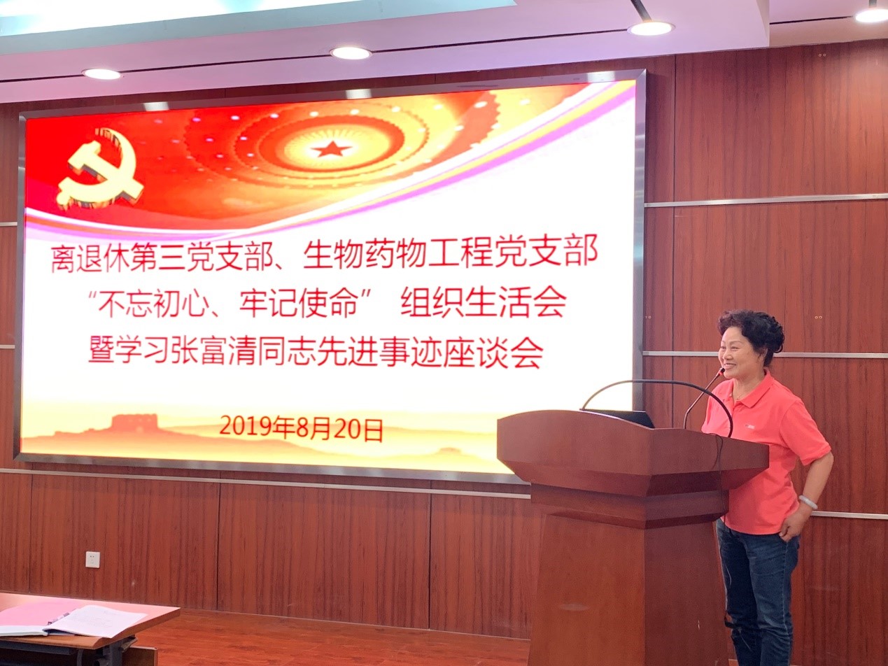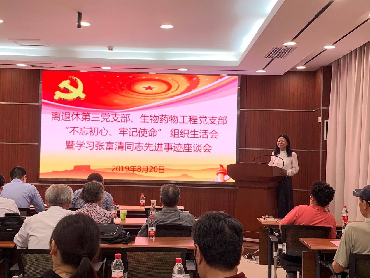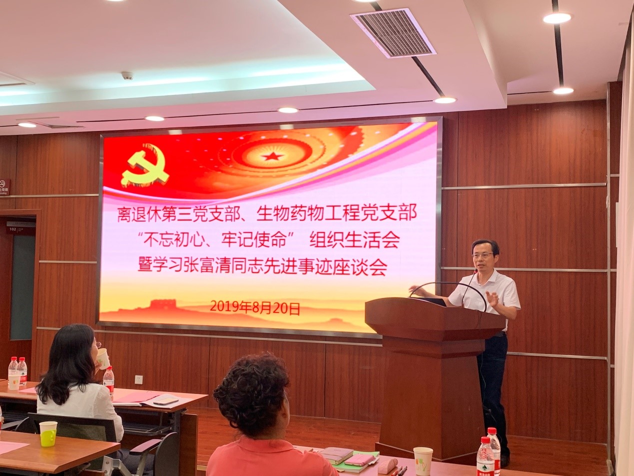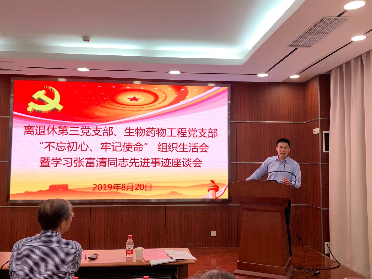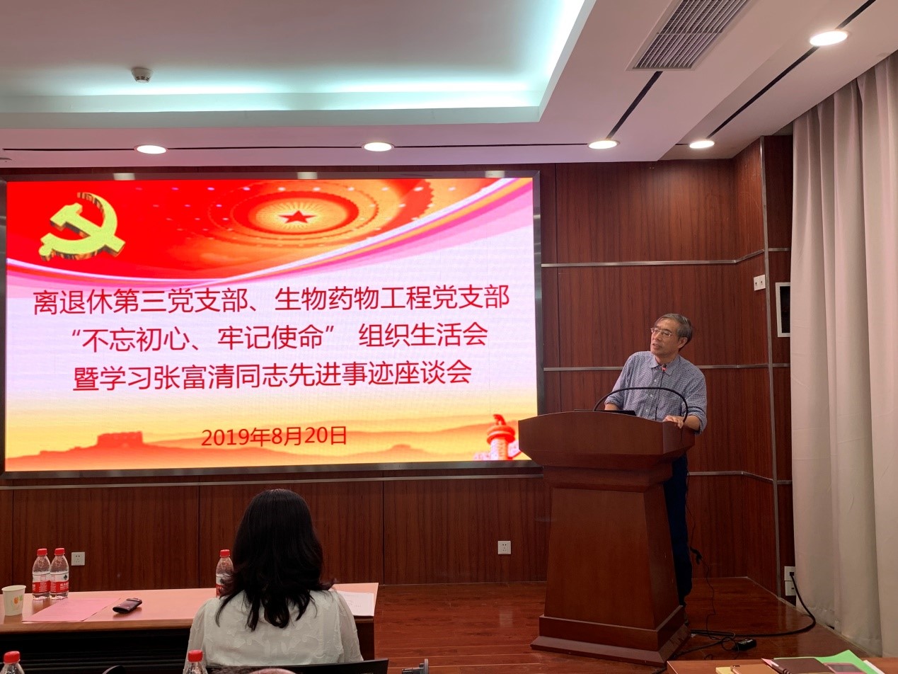 为积极开展“不忘初心、牢记使命”主题教育,并共促“老中青传帮带”,2019年8月20日上午,离退休第三党支部、生物药物工程党支部共同举办了“不忘初心、牢记使命”组织生活会暨学习张富清同志先进事迹座谈会,过程所副所长管兵应邀参加会议。会议由生物药物工程党支部书记张松平同志主持。会议内容主要包括:离退休第三党支部基本情况介绍、生物药物工程党支部基本情况介绍、集体学习张富清同志先进事迹、“不忘初心、牢记使命”主题发言、管兵副所长总结讲话等内容。