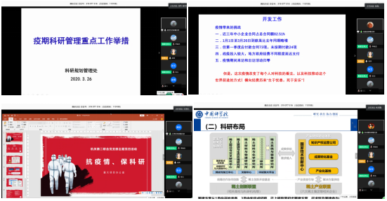 随后,为做好抗疫期间科研保障工作,机关第二联合党支部的科研规划管理处、科技合作处、重大办、廊坊分部和综改办、稀土院等业务处室的负责同志及部分工作人员分别介绍了疫情期间所做的工作,包括通过视频会议、现场轮流办公、网站发布及研究部个性化服务等方式多渠道联动推进项目申报、执行及结题。研究所采取的园区防疫配套服务等相应工作举措,保障了抗疫期间科研工作顺利有序开展。此外,与会人员也将疫情期间工作中存在的困难和问题进行了分享。