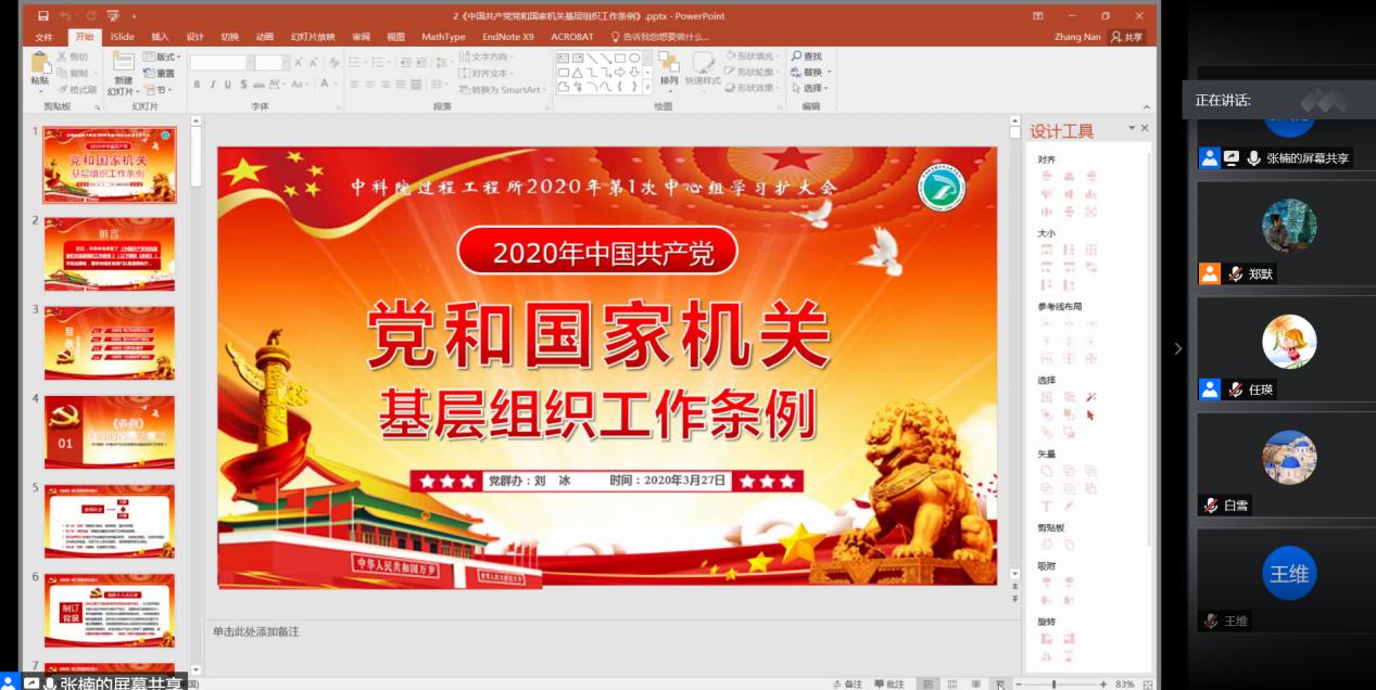 5月14日,U9彩票介科学党支部通过视频会议,组织召开“传达第一季度中心组学习讲话”的支部会议,包括传达习近平总书记在抗击新冠肺炎疫情工作中的重要讲话精神和党和国家机关基层组织工作条例,会议由支部书记王维同志主持。