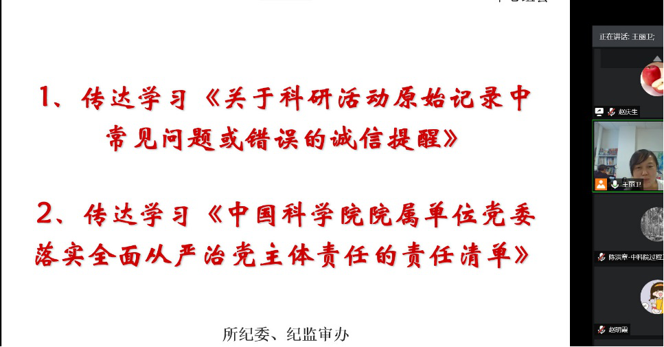 会议最后,支部书记赵庆生向大家传达了《关于科研活动原始记录中常见问题及错误的诚信提醒》《中国科学院院属单位党委落实全面从严治党主体责任的责任清单》相关文件精神,全体党员一致表示要在科研工作中认真落实。