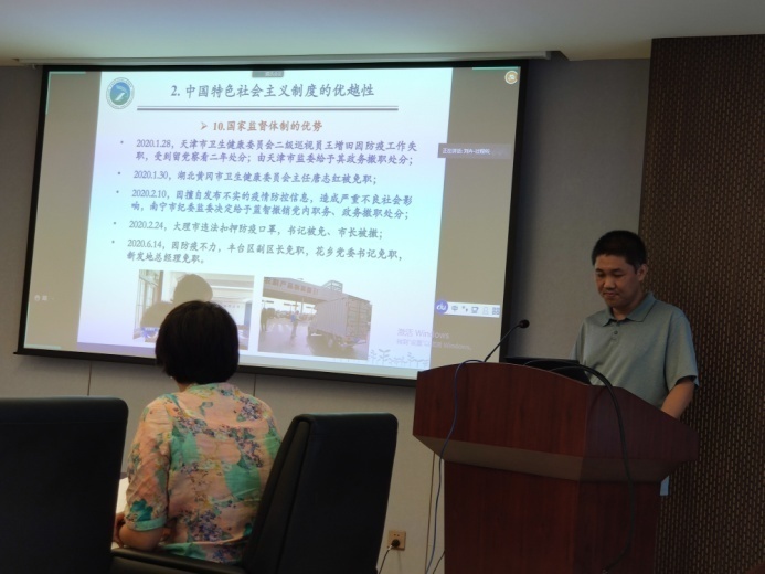 支部书记韩宁分享了《中国制度面对面》的读书心得体会。在当前的疫情防控斗争形势下,形成了党集中领导、统一指挥、物资充足、保障有力、众志成城、友爱互助的抗疫局面,彰显了中国特色社会主义制度党对人民军队绝对领导、集中力量办大事的体制、政治、经济、文化、治理、国家监督体制等优势。