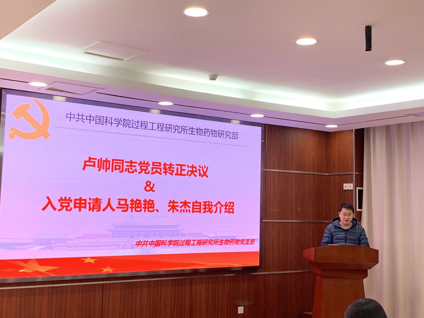 随后,党支部召开全体党员大会,介绍入党申请人马艳艳、朱杰,讨论预备党员卢帅同志党员转正。转正会议由支部书记张松平主持,支部共有正式党员19名,共收到赞成票19票,一致同意卢帅同志转正。卢帅同志也表示,会严格要求自己,不断加强理论学习,不断提高自身的政治素养和专业知识,做一名合格的共产党员。
