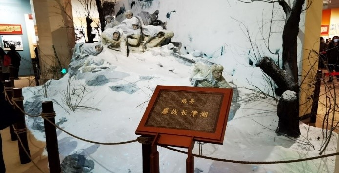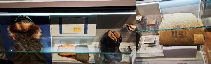 70年前,也是一个寒冷的冬天,在冰天雪地的朝鲜半岛,志愿军指战员们穿着单薄的衣衫,有的部队从我国南方直接开赴朝鲜战场,连棉衣都没来得及配备,手里拿的武器是“万国造”各式各样,只能以排或者连为单位统一规格制式。然而,就在这样艰苦的条件下,从1950年10月至1951年6月,中国人民志愿军与朝鲜人民军密切配合,以运动战为主要形式,连续进行5次战役,把侵略军从鸭绿江和图们江边赶回到三八线附近。展柜中展出了一件志愿军某部工兵连长丛树友穿过的军上衣,单薄褪色的衣服上还留有被敌人子弹打穿的6个孔。而另一个展柜中陈列着缴获的美军士兵的服装:皮毛马甲和手套,厚皮毛靴子和鸭绒睡袋。展馆的一角还原了鏖战长津湖战役中志愿军战士们的身躯与茫茫白雪融为一体的战斗场景。在这场战斗中,受命在“死鹰岭”高地伏击敌人的整连志愿军战士在零下30多度的寒冬里,身着薄棉衣、脚穿胶鞋,最后被冻成了冰雕!是怎样英勇顽强的意志让战士们不惧严寒、不畏生死?从志愿军某部誓师大会的誓词中可以感受到战士们英勇无畏,誓言奋勇杀敌的英雄气概。毛泽东主席在总结经验时曾说,志愿军打败美军,“靠得是一股气,美军不行,钢多气少。”随着展览的逐渐深入,一个个熟悉的名字映入眼帘:黄继光、邱少云、杨根思……再次重温他们的英雄事迹依然让人震撼而感动!展馆中悬挂着一段习近平总书记的讲话:“我们要铭记一切为中华民族和中国人民作出贡献的英雄们,崇尚英雄,捍卫英雄,学习英雄,关爱英雄”。