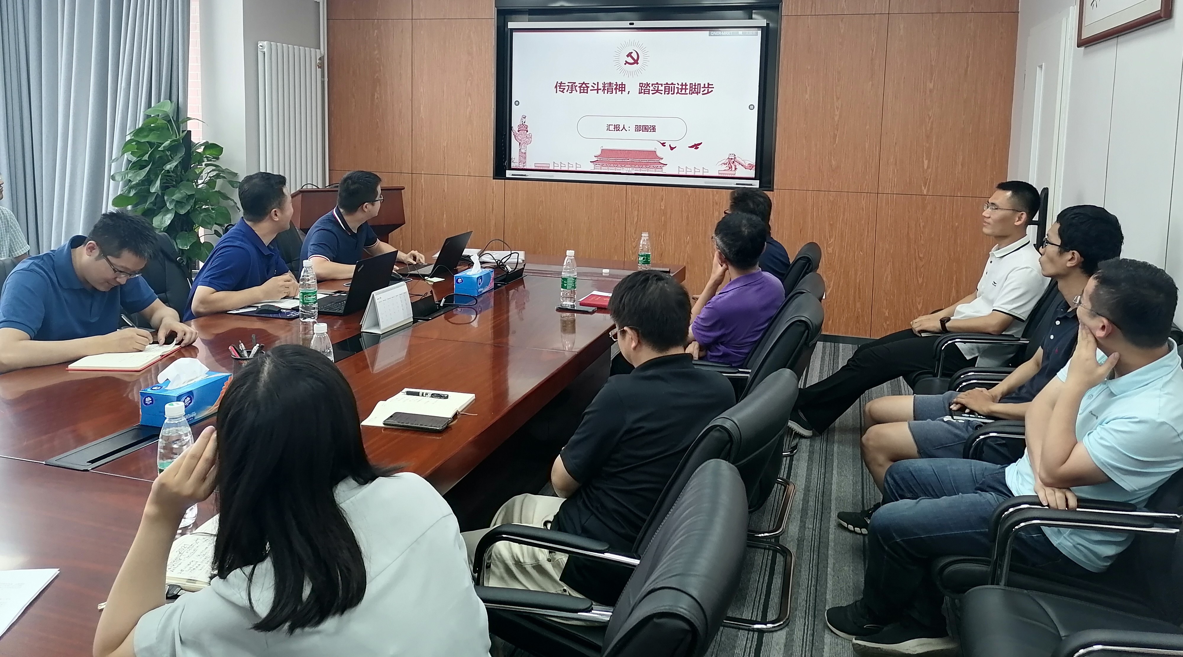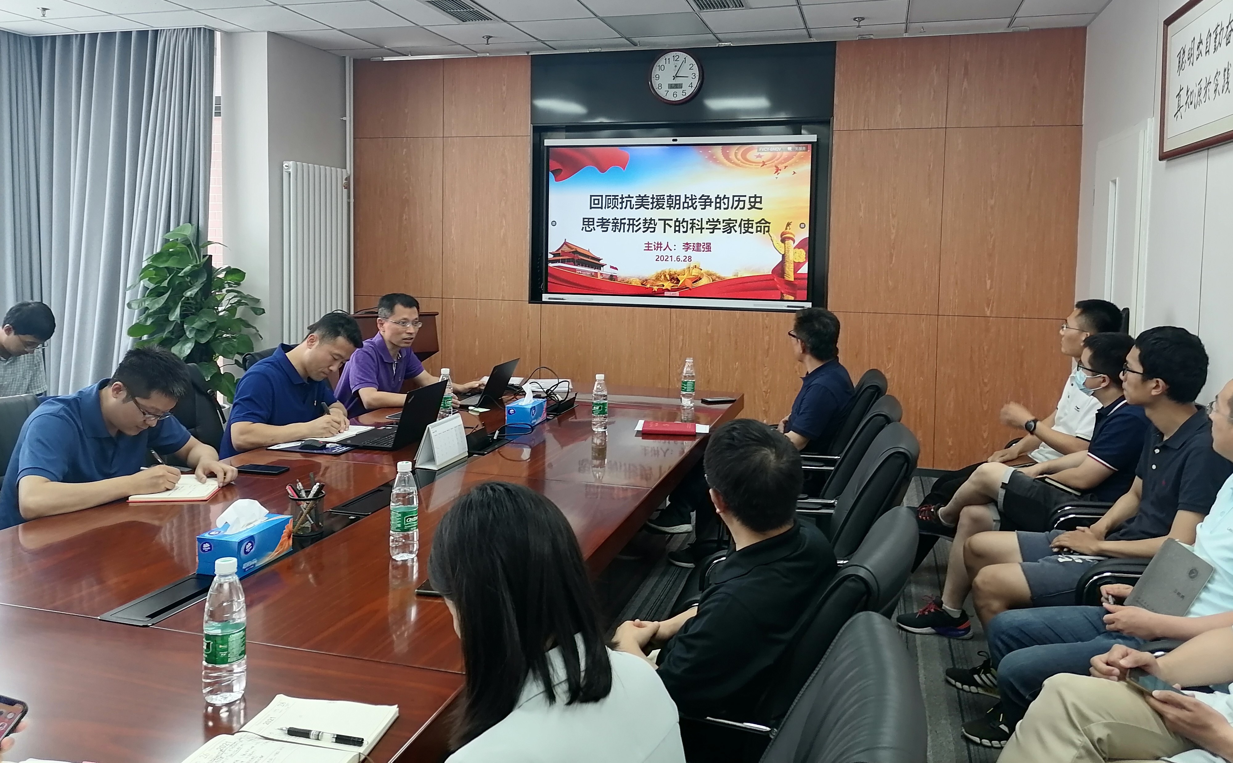 首先由党支部书记李建强同志带领大家进行“党史学习”教育。李书记以“回顾抗美援朝战争的历史 思考新形势下的科学家使命”为题,带领全体党员回顾了抗美援朝战争的光辉历程和宝贵经验,并结合当时的“第三十八集团军”和“上甘岭战役”两个典型案例,进一步阐述了抗美援朝战争锻造形成的伟大抗美援朝精神,就是祖国和人民利益高于一切、为了祖国和民族的尊严而奋不顾身的爱国主义精神,英勇顽强、舍生忘死的革命英雄主义精神,不畏艰难困苦、始终保持高昂士气的革命乐观主义精神,为完成祖国和人民赋予的使命、慷慨奉献自己一切的革命忠诚精神等。李建强谈到,中科院当时对抗美援朝的贡献包括研制抗生素和武器用的特种电阻丝等,这些方面说明,即使在战争年代,科学研究的重要性也不能忽视。最后,李建强指出,新形势下科学家的使命就是科技创新,我国要建设成为世界科技强国,关键是要建设一支规模宏大、结构合理、素质优良的创新人才队伍,激发各类人才创新活力和潜力,并鼓励年轻科研人员,要勇于承担责任,持之以恒做好本职工作,在工作中锤炼和打磨自己,为祖国的发展贡献一份力量。