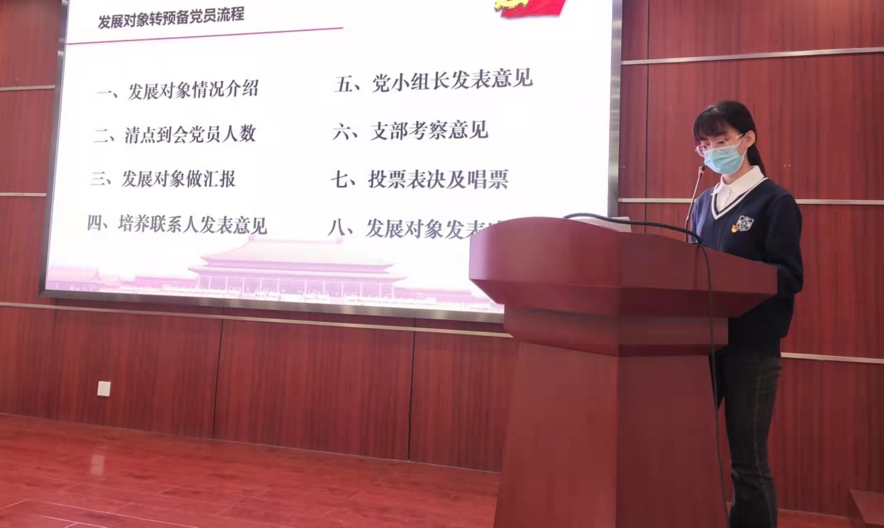 会议伊始,王雪莹简要介绍会议流程,并对首先要进行的预备党员接收大会的要求作出简要说明。紧接着,发展对象薛妍汇报了自己在培养期间的工作学习情况,正式向党支部提出入党申请。在汇报过程中,薛妍客观评价自身情况,并表示要坚持理论与实践相结合的原则,加强党性修养,努力做好本职工作,尽职尽责服务同学。而后,培养联系人和党小组组长分别介绍了薛妍在培养期的表现情况及意见,支委会向支部大会报告对申请人的审议情况,与会正式党员进行无记名投票表决。会议认为,申请人态度端正、立场坚定,在工作上认真负责,在生活中乐于助人,同意薛妍同志加入中国共产党。