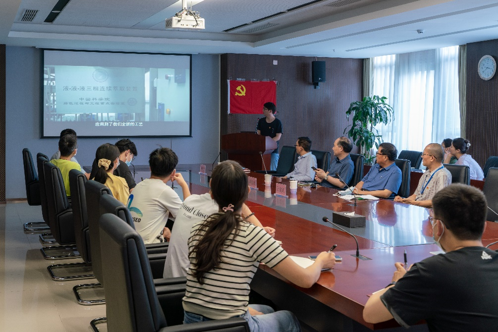 6月21日下午,绿色研究生第二党支部于过程大夏B座304会议室开展了“讲述身边故事、践行奋斗誓言”弘扬科学家精神主题党日活动。特别邀请了副所长杨超、绿色化工党支部书记邢建民、刘会洲研究员及绿色化工研究部副主任李望良研究员四位老师出席本次活动,绿色化工研究部辅导员陈思明老师和部分支部党员线上参与了此次活动。活动主要包括四项内容,分别是观看陈家镛先生记录片,与会老师讲述陈家镛先生事迹,毕业生党员科研经历分享,颁发支部活动纪念证书。会议由党支部书记陈文强同志主持。