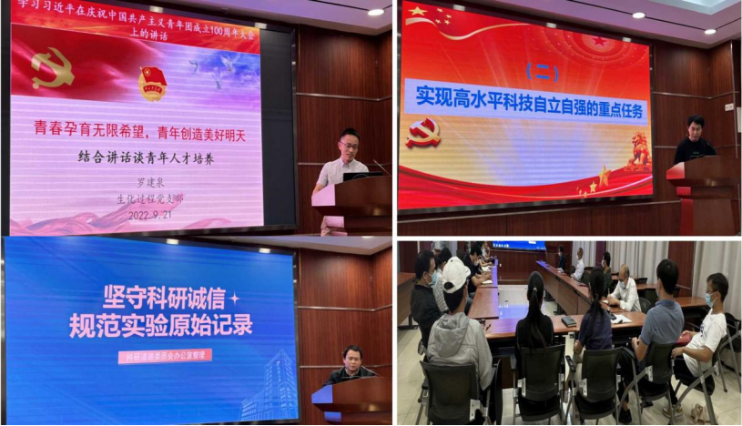 在党的二十大即将召开之际,生化过程党支部于9月21日在生化工程科研楼一楼会议室召开了支部全体党员大会暨“弘扬科学家精神、党建促科研”主题党日活动。会议由支部书记罗建泉同志主持。