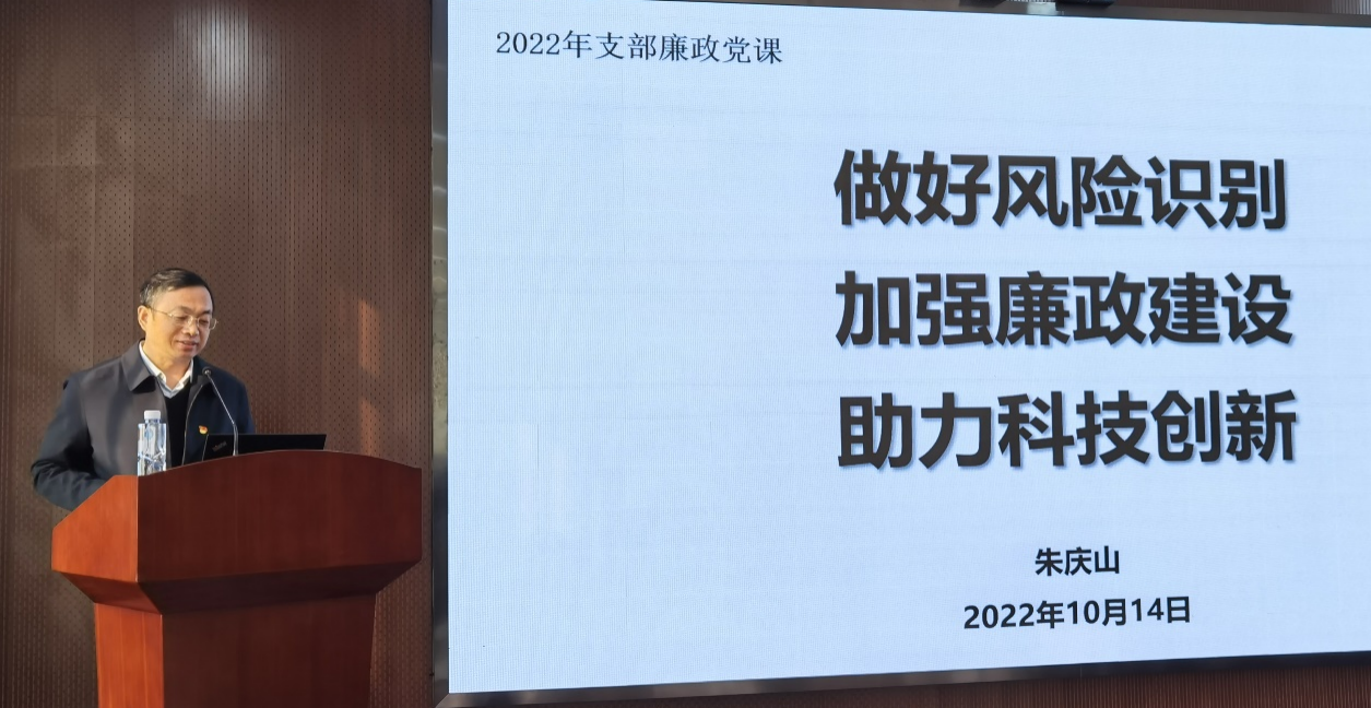 所党委书记朱庆山同志作《做好风险识别、加强廉政建设、助力科技创新》的廉政专题报告。在报告中,朱庆山书记结合实际案例从公务接待、差旅会议、试剂耗材、冒领受贿、科研诚信、实验室安全、反谍防谍七个方面深入剖析了我们身边的风险,并指出廉政建设是党的建设的重要组成部分,是新时期党的一项重大的政治任务。我们要严格遵守执行党的纪律和规矩,要以“主人翁”的精神爱党、爱国,在工作中要节约经费、杜绝浪费、脚踏实地、诚实守信、注重安全,对国家、单位、家庭负责。朱书记的报告使得与会党员更深刻地认识到风险防控的全面性、廉政建设的系统性和助力科技创新的现实意义。