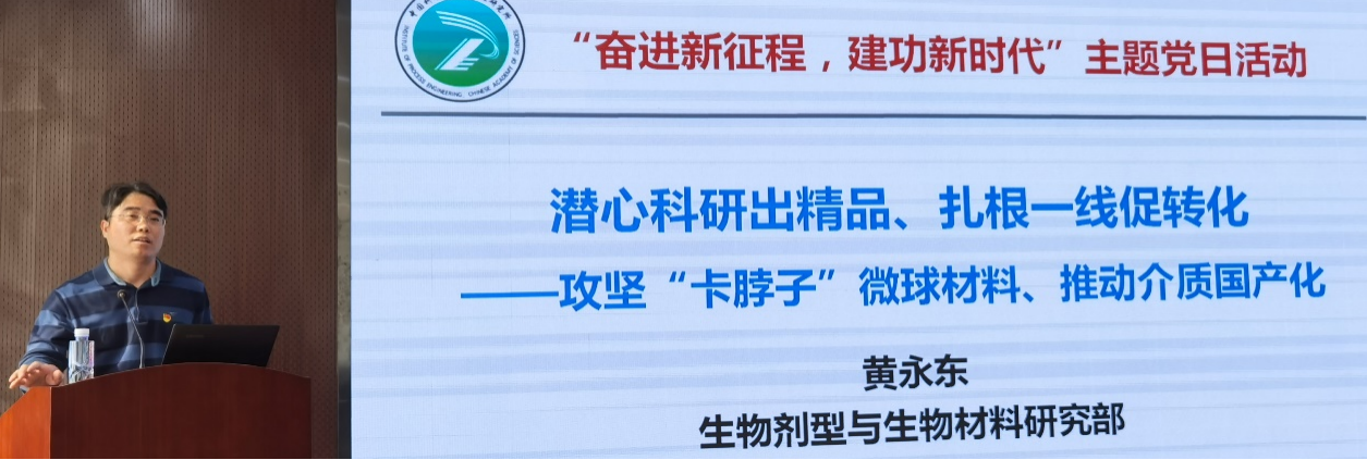生物剂型党支部黄永东同志作《潜心科研精品、扎根一线促转化》的报告。针对当前“卡脖子”技术——生化分离介质的行业痛点,黄永东同志面向国家紧迫需求,积极承担“国家责任”,长期扎根一线,致力于高品质生化分离介质的国产化。在报告中分享了团队在攻克多糖微球关键制备技术中的心路历程以及突破产业化瓶颈的经验和心得体会,阐述了创新成果的转化模式,介绍了科技成果转化应该关注的五大关键点。黄老师的分享使得与会科技党员充分认识到产业转化是系统工程,更需要专业化、系统化和全面化的思路和执行,从而反过来指导和定位我们的科学研究和技术开发工作。