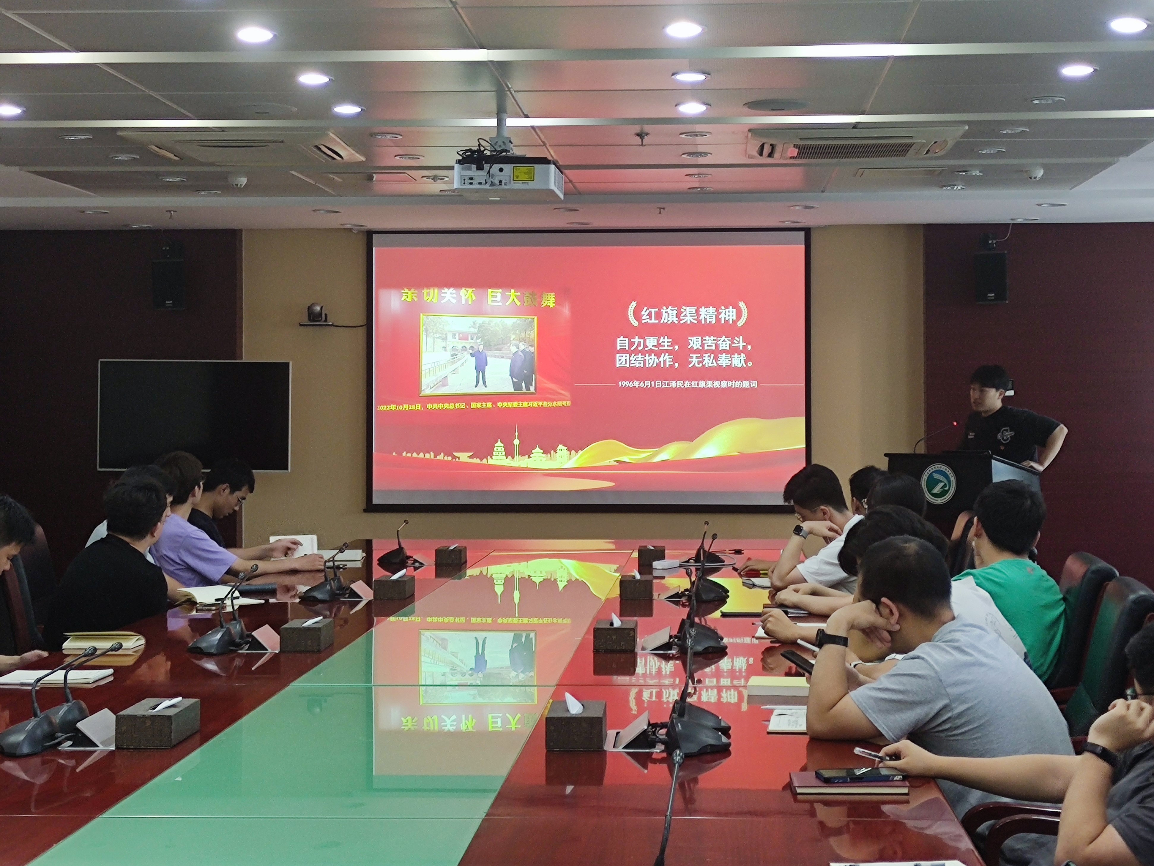 活动第四项是红旗渠红色主题教育活动交流分享。第一党小组组长许浩铭同志以开凿红旗渠的历史背景展开,自明代以来,大旱多发给河南林县地区人民带来惨痛的损失,甚至多次出现“人相食”的惨况。他讲述了,林县人民在新中国成立后团结一心共克艰难,在县委书记和县长的带领下硬生生在悬崖绝壁上开凿出来了一条生命之渠。无私奉献、不畏艰难的红旗渠精神深深感染了支部的每一位同志。