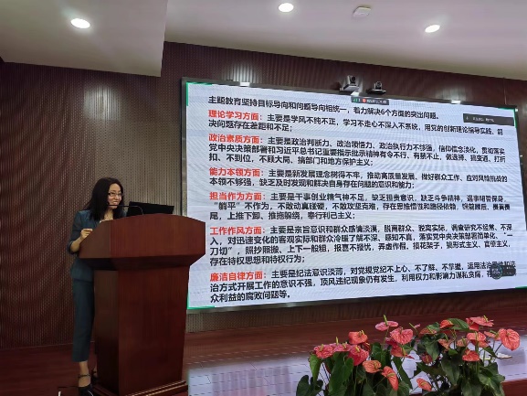 支部副书记王少娜同志带领与会党员和职工群众一同进行了主题教育专题组织生活会,王少娜同志介绍了主题教育着力解决的六个方面突出问题,随后带领与会党员和职工群众分别针对理论学习、政治素质、能力本领、担当作为、工作作风等方面展开了热烈的讨论。