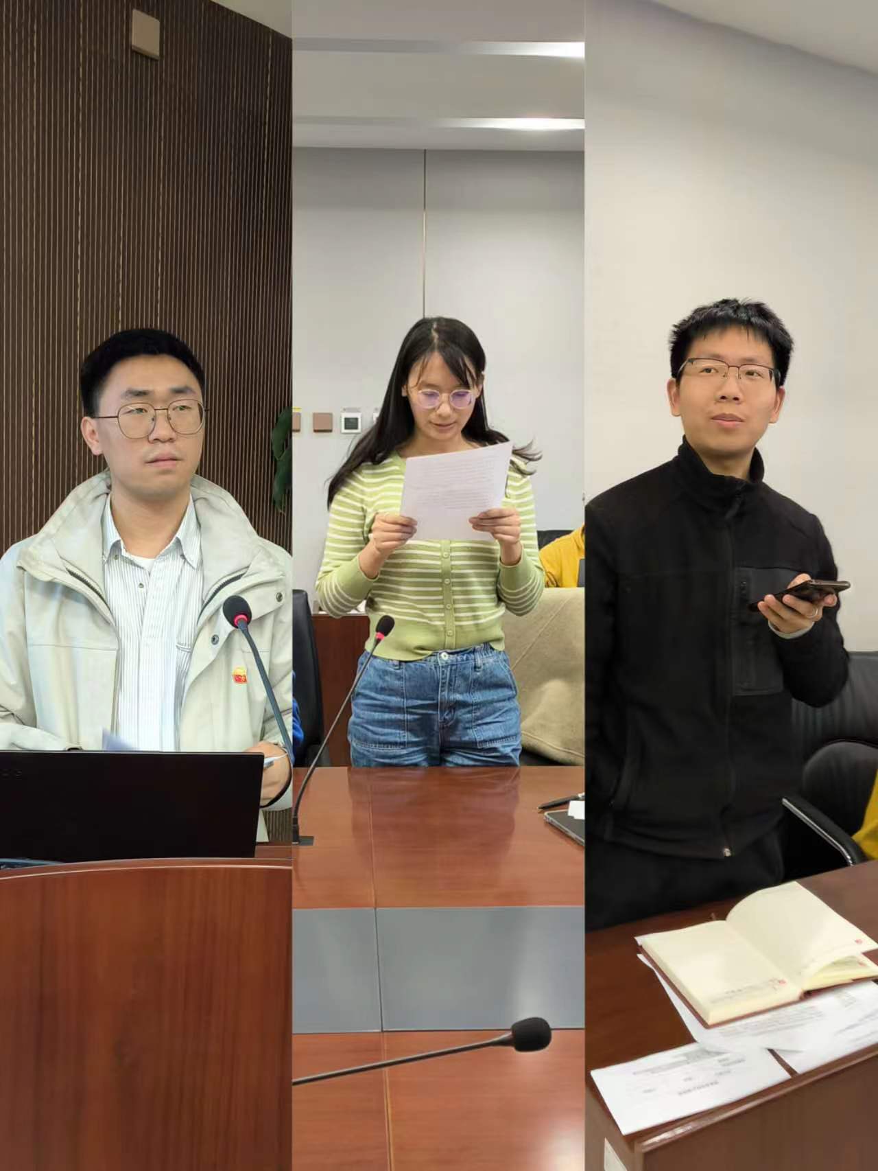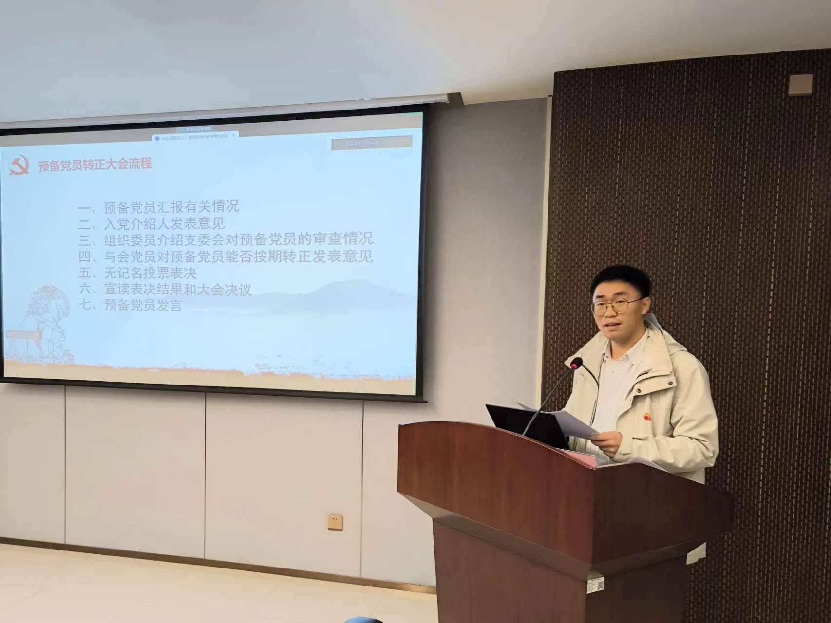 会议的第一个议程是讨论并表决马一新、庄晟逸两位预备党员转正的事宜。会议共有34名正式党员出席,符合表决条件。马一新、庄晟逸同志于2023年4月加入中国共产党,他们分别宣读了转正申请,详细汇报了在研究生阶段的理论学习、科研参与、学生工作以及平时生活等方面的经历。