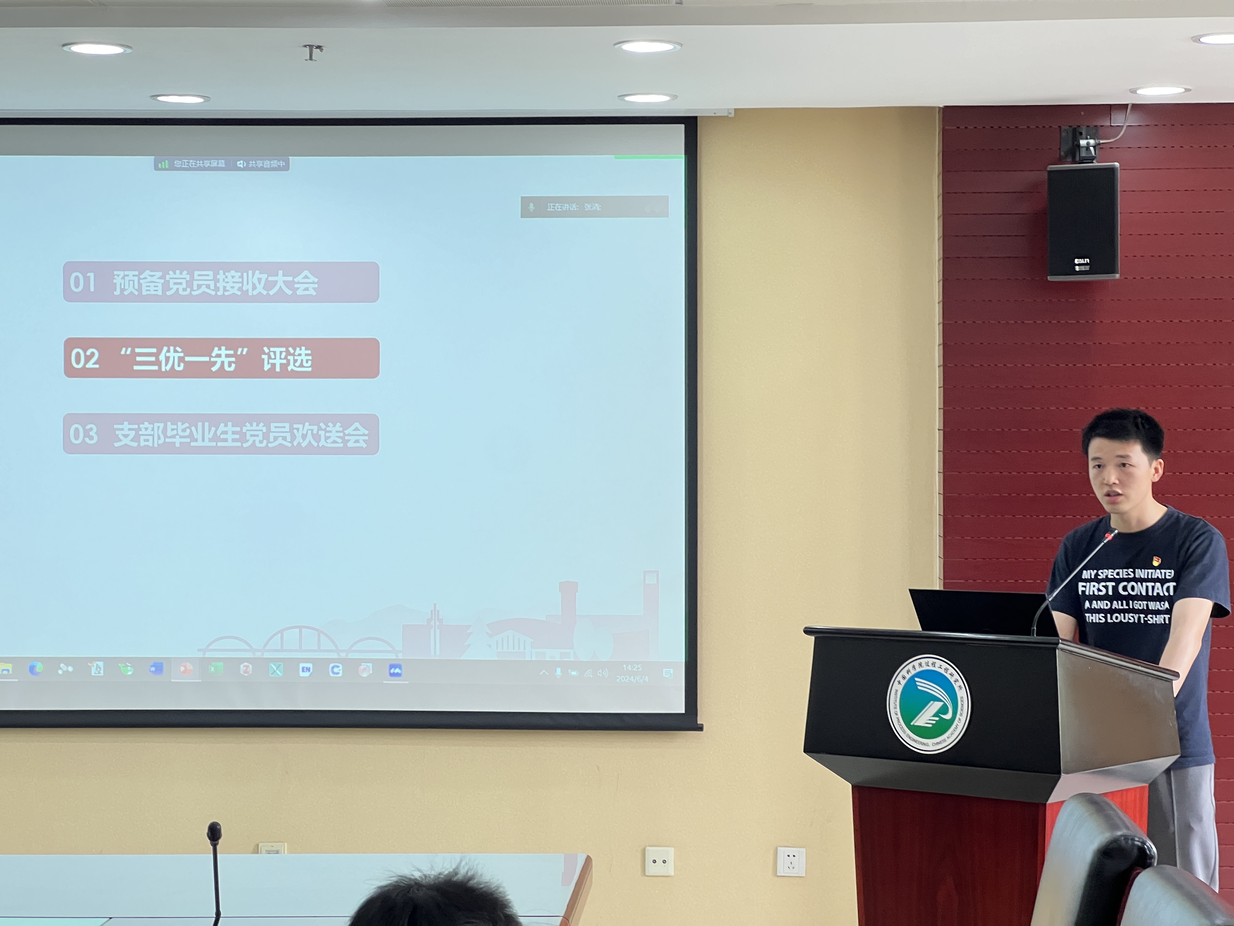 大会第三项——党课教育交流活动。该环节由支部副书记孙鹤同志进行主持。首先由毕业生党员同志带领大家通过相关书籍学党课、明党史,几位同志还结合自身的科研经验、求职过程和心态调整等方面分别进行了交流与分享。每位党员分享结束后,台下同志踊跃发表意见与心得,最后由环境研究部学生辅导员石凤琼老师和研究生党总支书记杨帆老师总结。两位老师对党支部的工作给予了表扬。杨帆老师表示,党支部在各项工作中展现出很好的凝聚力,有效推动了相关活动的举办;石凤琼老师表示,祝愿每一位毕业生在今后的道路上都有更好的发展。