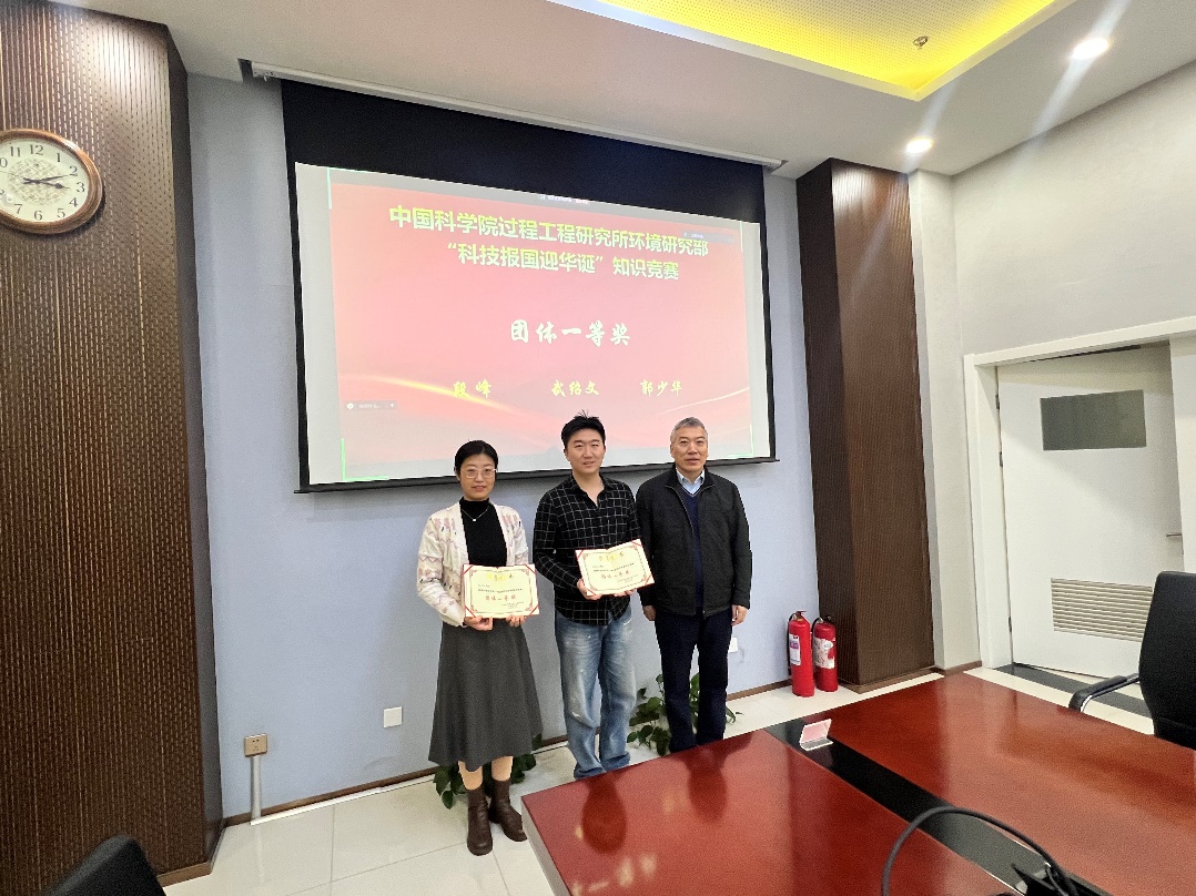 在新中国成立75周年和中国科学院建院75周年之际,环境党支部联合研究部分工会于9月组织了“科技报国迎华诞”知识竞赛活动,由24名职工组成的8组队伍参赛。经多轮比赛,4支队伍决出了一、二、三名。通过知识竞赛,提升了各位职工对党的理论知识的掌握,了解了中国科学院在成立以来改革、决策、成绩等光荣事迹。会上,阎文艺主持 “科技报国迎华诞”知识竞赛颁奖仪式,曹宏斌研究员为“团体一等奖”获奖团队成员(段峰、郭少华、武绍文)颁发奖状。