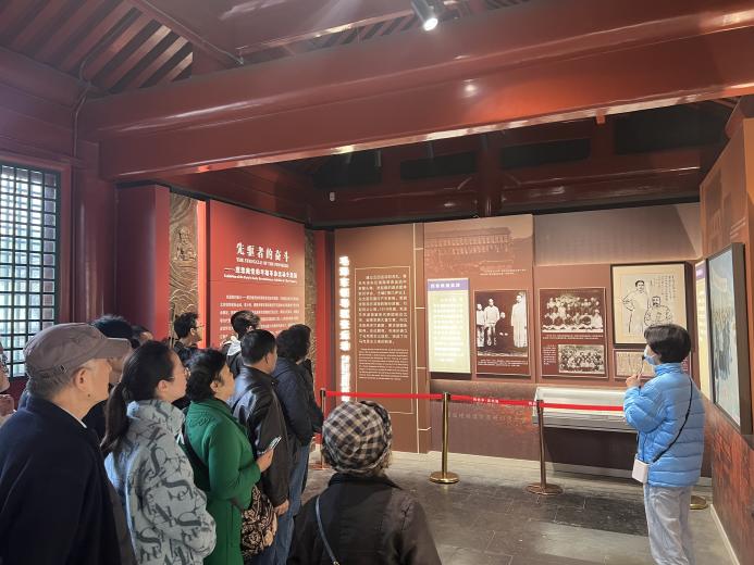随后同志们来到了承载着厚重历史与文化底蕴的京报馆旧址,一同追寻邵飘萍先生的足迹。京报馆旧址,不仅仅是一座中西结合的院落,更是见证了《京报》创始人邵飘萍先生为新闻事业和革命事业不懈奋斗的一生的历史根据地。京报馆墙上的一张张照片与一份份报纸仿佛在诉说着那段历史。报纸,作为那个时代传播新知、启迪民智的重要工具,承载了无数志士仁人的心血与智慧,发表观点,揭露社会的不公与黑暗,唤起民众的觉醒与抗争。以《京报》为阵地,用犀利的笔锋揭露了北洋政府的软弱和西方列强的丑恶,激励那些有志青年站出来去反抗、斗争。在那个战火纷飞的年代,邵飘萍先生因为坚持真理和正义,严词拒绝30万元的利诱,坚持真理,报道真相,但最终被反动势力所迫害。他用生命捍卫了新闻自由和言论的真实,他的勇气和牺牲,成为了后来者心中不灭的灯塔,照亮了中国革命的前景。无愧于“铁肩担道义,辣手著文章”。令参观的同志铭记革命先辈的英勇奋斗与无私奋斗,也感悟到革命的初心。