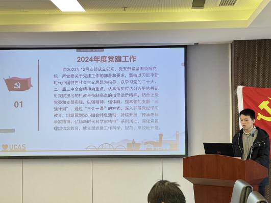 大会第三项为党支部年度总结。支部书记张清就2024年度支部工作向党员们进行了汇报。在这一年工作中,支部完善了组织建设,加强了思想建设,严格执行“三会一课”制度,扎实开展主题党日活动,努力将党建活动与科研学习相融合,真正去解决同志们遇到的难题。但由于支部成立时间较短,也存在一些问题,比如:党小组会的形式不够丰富、党建工作与科研学习融合不够、党员意识有待加强等,根据对工作的总结和反思,支委会也商议了下一年的工作计划,希望在党委、党办、研总支的指导下,在每一位党员同志的共同努力下,党支部工作能够越做越好。