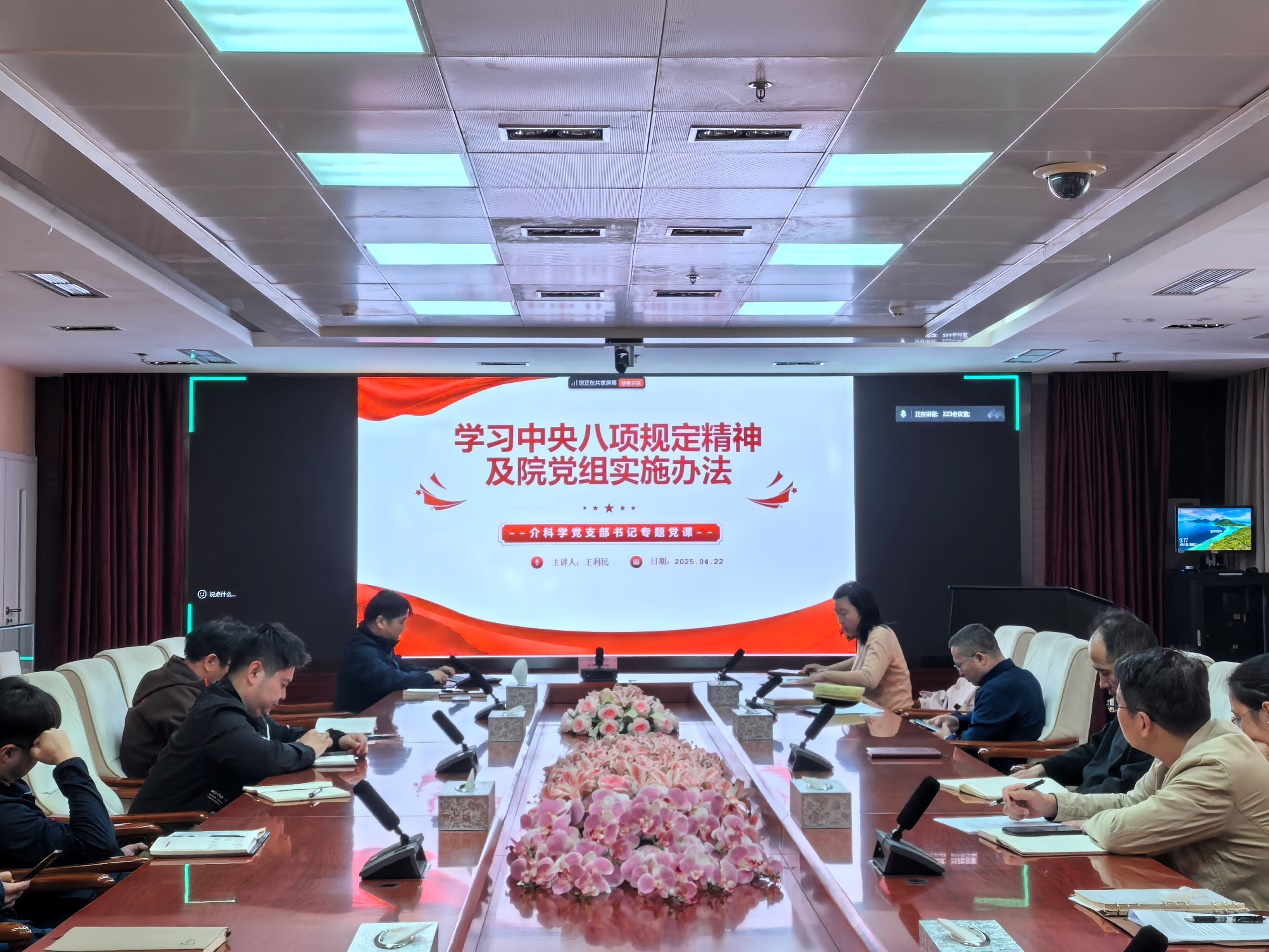 支部书记王利民同志讲专题党课,领学中央八项规定精神及其实施细则,重点介绍了院党组 2023 年修订的实施办法,包括新增的“减少陪同”要求、对文件简报的新要求,以及对文稿发表、宣传报道等方面的具体规定。王利民同志还总结了近几年介科学党支部涌现出的典型事迹和先进人物,号召全体党员对标榜样、以身作则,将作风建设融入科研日常,发挥党员先锋模范作用。