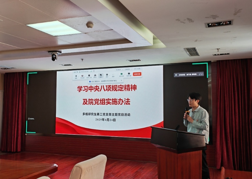 会议第二项,宣传委员郝子康同志领学中央八项规定精神及院党组的实施办法。报告通过剖析违规吃喝、收送礼品、违规接待、公款旅游等典型案例,加深了参会同志对于中央八项规定精神的理解,以及推进纪律建设作风建设常态化长效化的意义。在交流讨论环节,同志们充分认识到严明纪律、廉洁自律对于科研和工作的重要意义,在今后的学习和工作中,既要稳妥落实政策要求,又要始终保持严谨务实的工作态度。