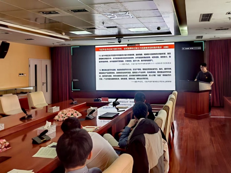 大会第三项,组织委员李卓卿同志带领大家学习贯彻习近平总书记关于厉行节约、反对浪费和过紧日子的重要讲话精神。通过交流讨论,党员们进一步明确了坚持勤俭节约的内涵和责任,纷纷表示将以此次学习为契机,在今后的学习、科研和生活中严于律己、争创佳绩。