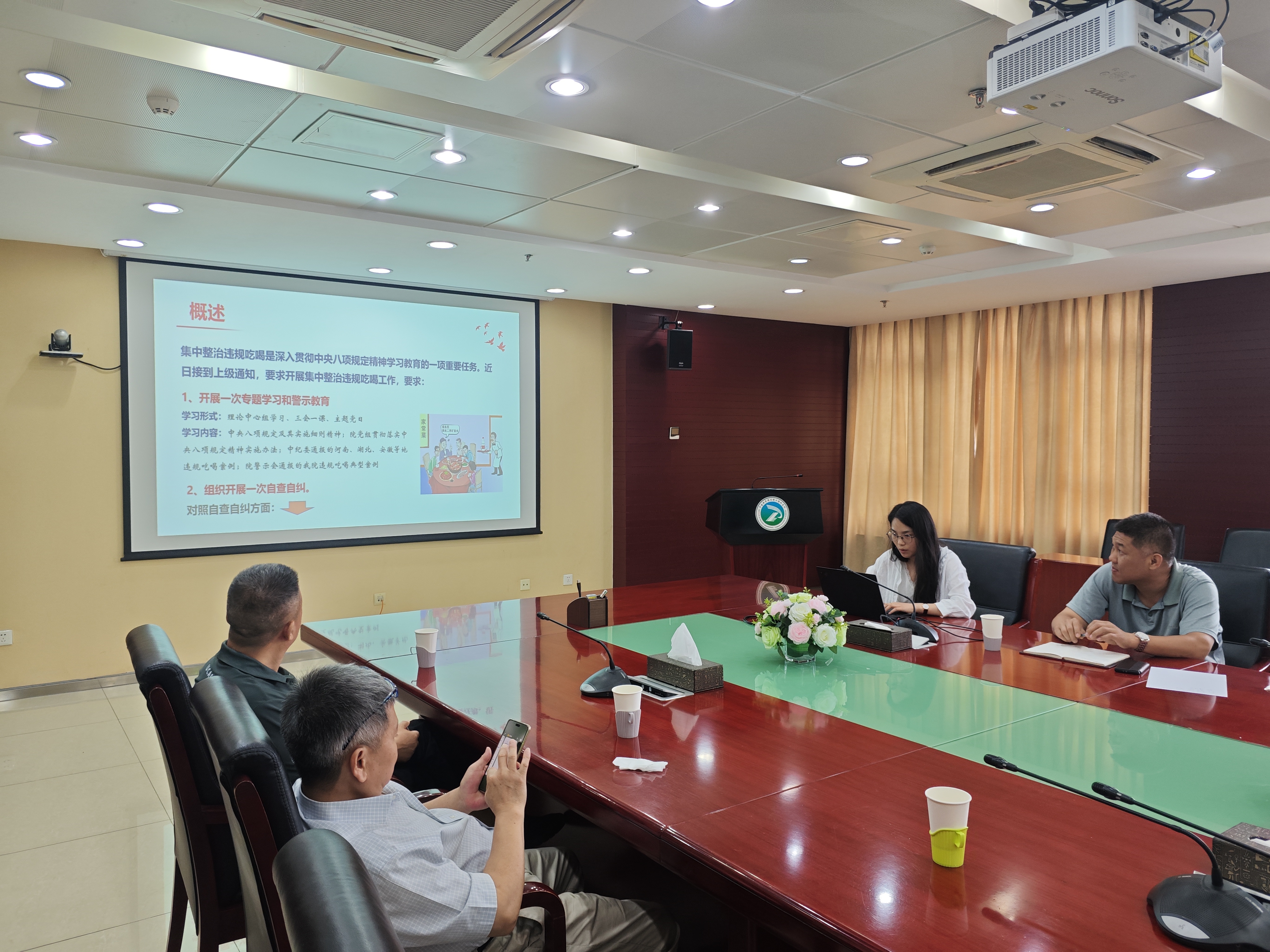 最后由纪检委员杨雪彤通报违规吃喝警示案例。集中整治违规吃喝是深入贯彻中央八项规定精神学习教育的一项重要任务。吃喝问题可能是一个人腐化变质、违法的开始,继而“四风”问题和“七个有之”交织勾连。通过案例警示学习,引导广大党员知敬畏,守底线,防微杜渐。