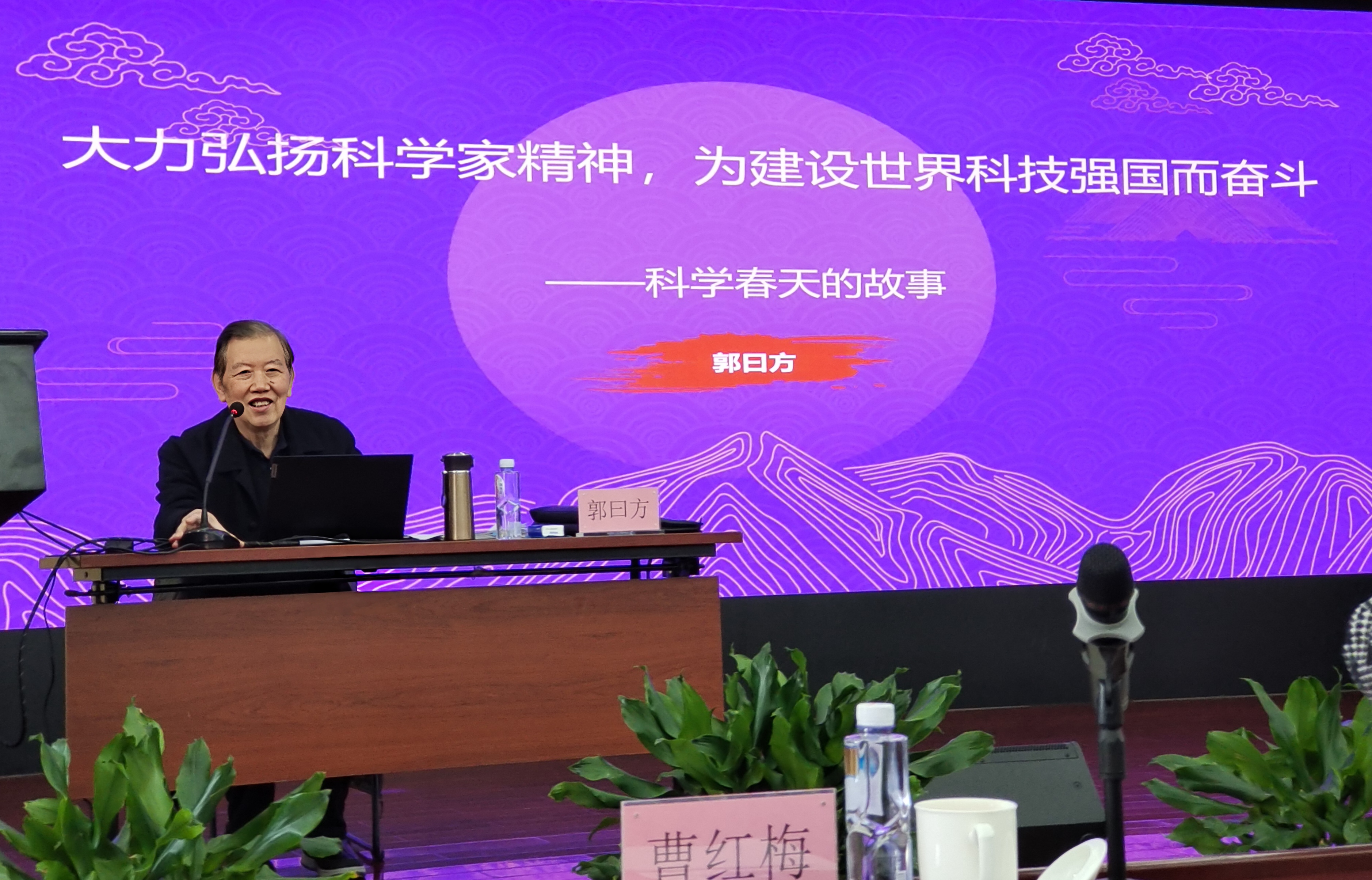 84岁高龄的郭曰方老师曾参与筹备1978年的全国科学大会,1979年中美建交,他有幸随同邓小平同志和方毅同志出访美国。他多次荣获中央国家机关和北京市的优秀共产党员、“金辉老人”称号和北京市抗癌明星,如今耄耋之年,依旧神采奕奕地宣讲科学家精神。他以自己的亲身经历讲述了吴仲华、赵忠尧、钱三强、邓稼先、郭永怀等老一辈科学家放弃国外优越的科研环境和生活,毅然决然回到祖国,为国家科技事业的发展作出巨大贡献甚至献出自己宝贵生命的动人故事,使我们深受教育。