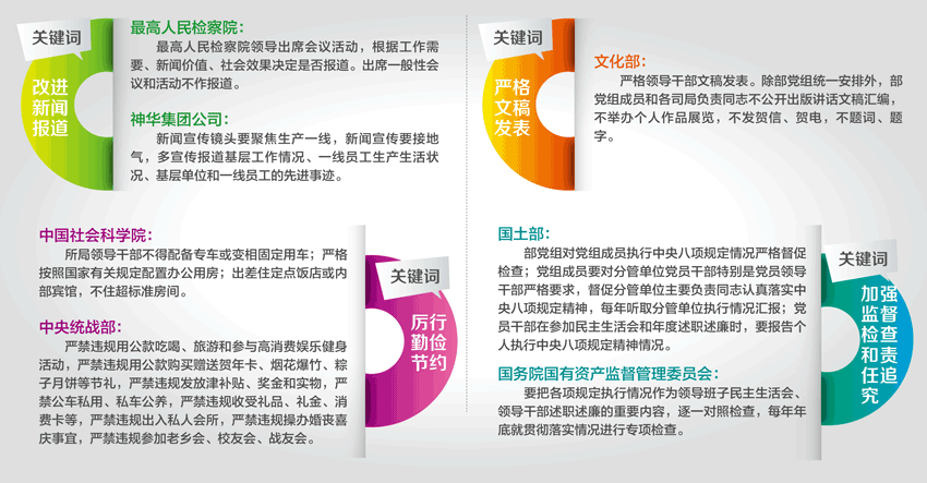 八项规定实施以来,各单位紧密联系部门实际,坚持“探索实践在前,总结提炼在后”,不断把经实践检验过的好经验、好做法上升为制度措施,修订做不到的内容,不断增强制度执行力,为中央八项规定精神落地生根提供有效的制度支撑。(中央纪委监察部网站 王小宁 刘芳源|制图 王婵)