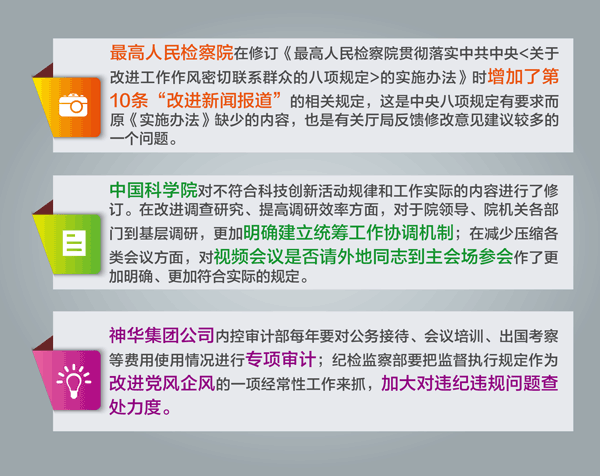 “紧密联系本地区本部门本单位实际,检查落实中央八项规定精神的措施执行情况”,十八届中央纪委七次全会明确要求,“总结经验、梳理问题,实事求是地对措施加以修订”。截至目前,已有60多个中央和国家机关对贯彻落实中央八项规定精神的实施办法进行修订;中央企业和金融机构在落实中央八项规定精神“回头看”中修订完善配套制度1100多项。