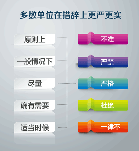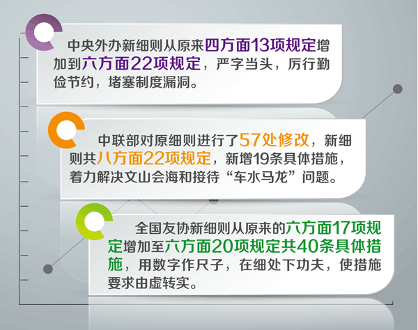 多数单位在接待标准、会议规格、经费使用、文稿字数、礼宾安排、用车用房等方面,取消“原则上”“一般情况下”的笼统表述,更多使用“不准”“严禁”等词语体现了从严从实,更严更实。