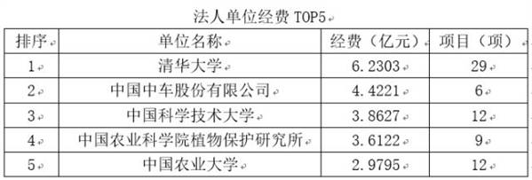 值得关注的是,上述1078个项目由557家法人单位牵头承担,包括112所高等院校、225家科研院所和220家公司企业。其中高校承担了395个项目,同比降低1.8%。与去年相比,虽然在承担项目上有所减少,但是在获批经费上同比增加4.8%,达76.7亿元。以变化较大的农业科技领域为例,农业科技在高校的经费和项目投放上则增加了约15%。