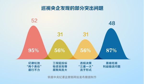 “四个意识”不强,聚焦主业主责不够,落实中央对企业改革发展的政治定位和战略要求存在差距,对上次中央巡视发现问题整改不力;党内政治生活不够严肃,执行民主集中制不到位,有的领导人员没有如实向组织报告个人有关事项;执行干部选拔任用规定不严格,对违规用人、搞“小圈子”问题反映较多;“两个责任”落实不够到位,重点领域存在廉洁风险,有的领导人员纪律意识淡薄,顶风违反中央八项规定精神,有的利用企业经营管理权谋取私利等。