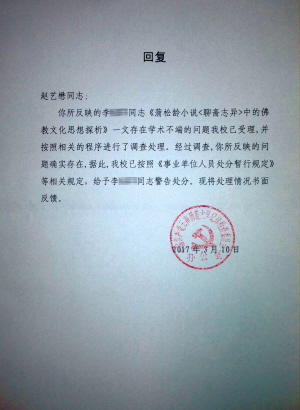 6月14日,微博名为“西选笑雪”的网友发布消息称,自己于2006年在云南师范大学所完成的本科毕业论文《论佛教对〈聊斋志异〉构建鬼狐仙怪世界的影响》竟遭同校副教授剽窃。该名李姓副教授将其毕业论文删减修改后,改名为《蒲松龄小说〈聊斋志异〉中的佛教文化思想探析》,并以个人名义发布在《云南电大学报》上。