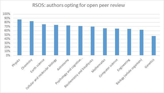 2014年,英国《皇家学会开放科学》期刊启动,它提供了选择性的开放同行评审模式,评审报告可与文章一起发表。结果表明这种模式非常受欢迎,大部分科学家选择发表同行评议报告,有一半的审稿人在他们的报告上签名。其接受比率按照自然科学学科不同存在差异(如图)。