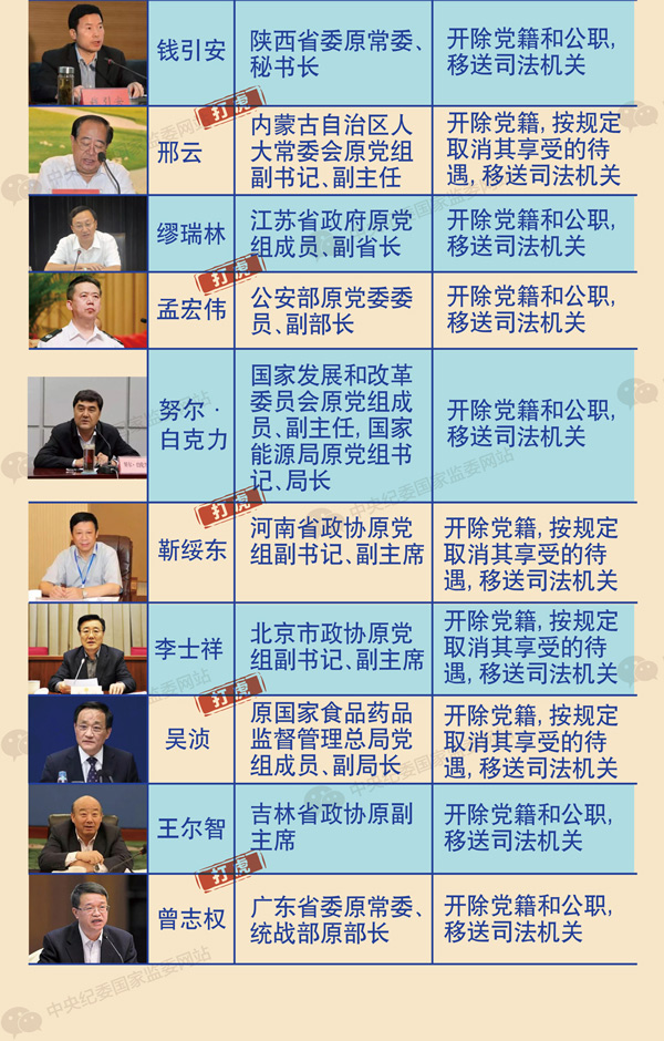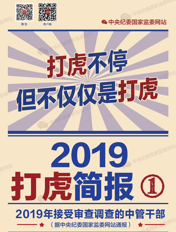 2019年全年,中央纪委国家监委网站公布了秦光荣、李谦、彭宇行等20名中管干部接受中央纪委国家监委审查调查消息,以及缪瑞林、孟宏伟、努尔·白克力等23人的党纪政务处分结果。