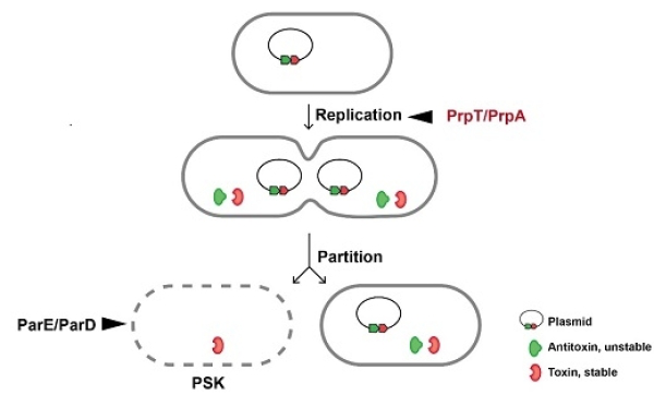 毒素/抗毒素系统(Toxin/Antitoxin System, TA)是较早发现具有稳定质粒功能的二元系统。TA系统在1983年发现存在于接合型质粒上,在功能上被认为通过“分离后致死效应“(Post-segregational killing, PSK)来维持质粒的稳定性。在PSK理论中,当质粒在细胞分裂过程中由于复制或分离错误发生丢失时,在不含质粒的子代细胞中,相对稳定的毒素蛋白会由于失去抗毒素的中和作用,发挥出毒性抑制细胞的分裂或直接杀死细胞,达到在群体中维持质粒稳定存在的目的。ParDE系统是较早支持PSK理论的研究模型之一。随着基因组测序技术的发展,大规模的临床和环境微生物基因组分析发现接合型质粒上富集大量TA系统。2000年,新西兰坎特伯雷大学教授Heinemann研究团队在PNAS的文章中提出了PSK理论的不足,认为质粒上TA系统的富集是质粒与质粒间竞争的结果,并非是通过PSK机制实现的。PSK理论很容易通过在模式细菌中异源表达TA来证实,因此一直被广泛用来作为解释质粒上富集TA系统的理论基础,但仅用异源表达的手段来研究TA的功能存在局限性,容易忽视TA系统的多样性生物学功能。