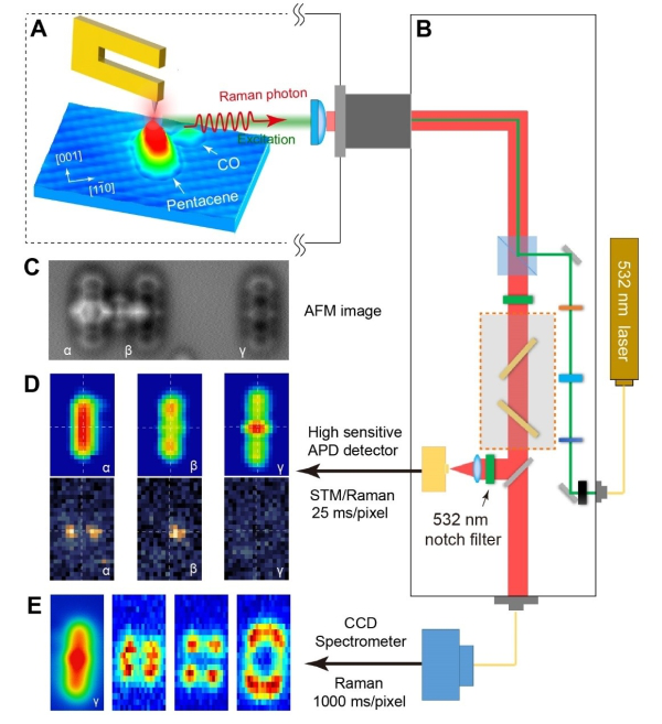 基于扫描探针的单分子多参量测量示意图:(A)探针;(B)拉曼光谱光路;(C)AFM像;(D)STM像和利用高灵敏单光子计数器同步采集的C-H振动拉曼光谱像;(E)分子骨架结构的拉曼光谱像。