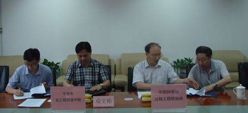 宁波市化工研究设计院有限公司董事长项文裕、执行董事孙朝元,U9彩票所长张锁江研究员、北京市重点实验室副主任李春山研究员出席会议并代表双方签订协议。会议中双方就项目合作方案进行探讨交流并形成初步意向,下一步将针对具体成果展开技术交流和目标企业筛选,制定详细推广策略。