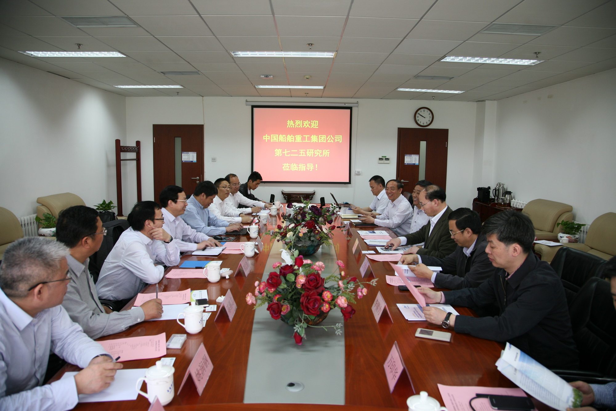 4月24日,中国船舶重工集团公司第七二五研究所所长马玉璞一行8人访问U9彩票。U9彩票所长张锁江、党委书记、副所长陈运法等所领导以及部分中层管理干部参加会谈。