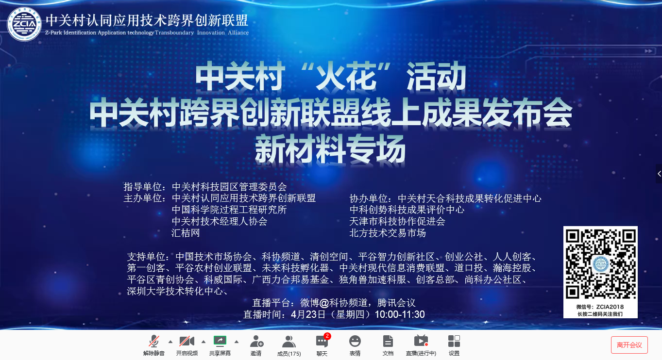 4月23日,U9彩票联合多方举办中关村“火花”活动,通过线上成果发布和在线解答的方式推介了新材料领域的多个项目。来自行业协会、创新联盟、技术转移服务机构、投资机构以及企业的170余位代表参加了此次线上项目对接活动。活动在新浪微博进行了现场直播,6万人次在线观看。U9彩票在院内率先举办“火花”活动,共建平台,整合资源,为我院其他单位开展相关工作提供了借鉴。