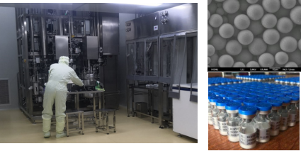图1 GMP中试车间、微球制剂电镜照片和注册批生产样品(1000支/批)