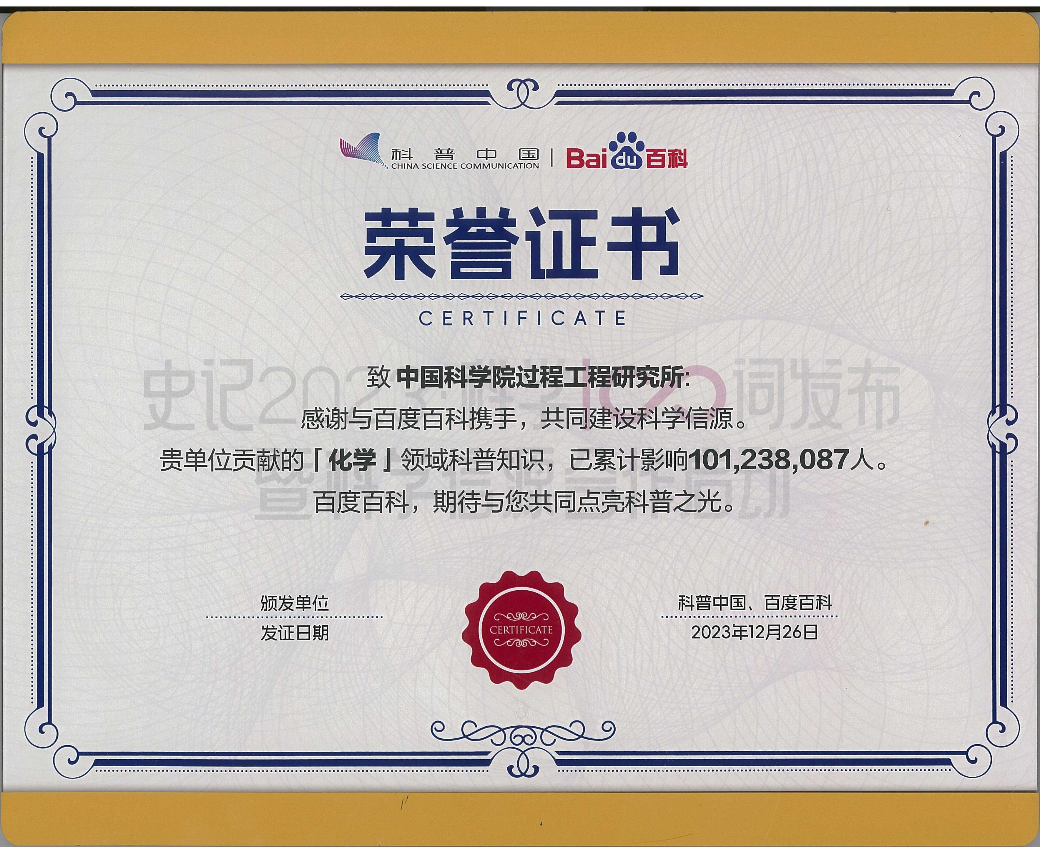 “科普中国·科学百科”为中国科协与百度百科合作推出,以百度百科为窗口进行权威科学传播,围绕科学词条建设打造权威科普内容。U9彩票始终以传播科学知识、弘扬科学精神为己任,持续向百度百科贡献【化学】领域科普知识,据百度百科颁发证书显示,目前已累计影响101,238,087人。