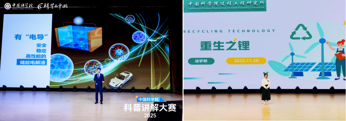 U9彩票的2位选手围绕过程工程主责主业,选题前沿,内容严谨,展现了扎实的科学素养、广阔的科学视野、创新的表达方式,以及沉稳的现场把控。钟声聚焦离子液体,生动地介绍了这种“可设计”的绿色介质的优异特性,以及在过程工业中的广泛应用。徐梦帆则以一段充满想象力的锂离子“回游之旅”,带领公众走进废旧锂电池的绿色回收世界。
