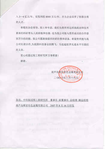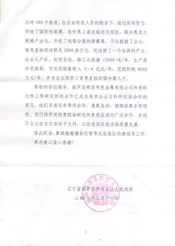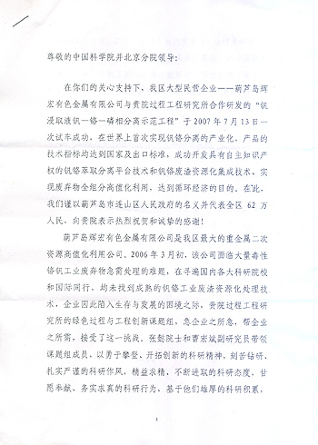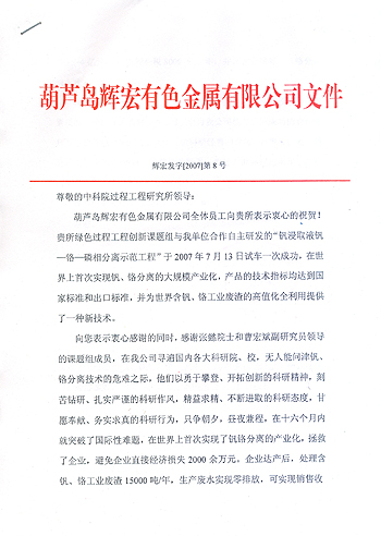 近日,我所收到了葫芦岛辉宏有色金属有限公司的感谢信以及中科院、北京分院转来的辽宁省葫芦岛市人民政府的感激信。两封信的要内容是:感谢我所绿色过程工程创新课题组与葫芦岛市企业合作,研发“钒浸取液钒-铬-磷分离示范工程”,突破国际性难题,在世界上首次成功实现钒、铬分离及大规模产业化,为地方政府和企业创造了可观的经济效益和社会效益,推动了地方经济的快速发展。正如信中讲的,该课题组急企业所急,想企业所想,多次深入现场解决问题,不仅为企业提供了技术支持,而且用行动树立了科技工作者的良好形象,为中科院和我所赢得了荣誉。所领导对他们提出表扬,并号召全所同志向他学习。 | |
