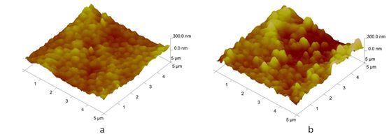 PES 100kDa超滤膜污染前后AFM 3d图 a:污染前;b:污染后