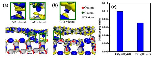 图1. 复合物界面处的电子差分密度图: (a) GD-TiO2(001), (b) GR-TiO2(001); (c) 复合物中GD和GR表面上的 Mulliken 电荷